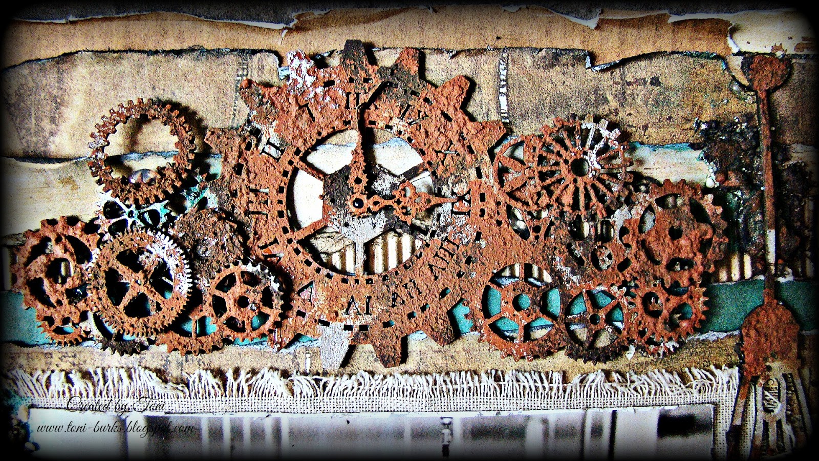 This layout has layers of different textured papers as well as rusty elements with the cogs and light fixtures.